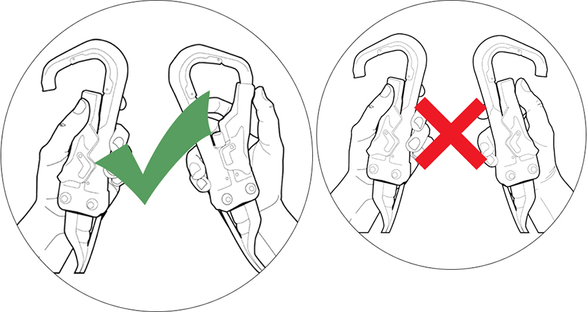 1、按下登山扣門打開解鎖的掛鉤,第二個登山扣保持鎖定狀態(tài)。