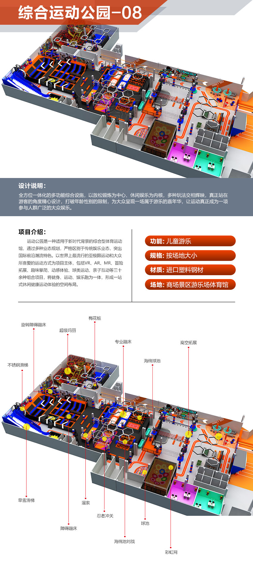 本項目適用于各種親子主題類的樂園,巧妙運用“熊貓”IP造型設計,集拓展、探險、滑道、飛索、蹦極、不銹鋼滑梯、攀巖、爬網等46種不同運動體驗的文化主題項目,結合“大灰熊”IP形象,融入相關設計元素,打造差異化的網紅IP主題性運動拓展營地綜合體。 在裝飾設計上采用竹葉和竹竿的綠色設計元素,以原生態、自然風格為基調,采用原木、繩網和不銹鋼等柔韌度好的生態材料。滿足大眾貼近自然、主題鮮明、寓教于樂的兒童素質訓練教育親子樂園的精神訴求。