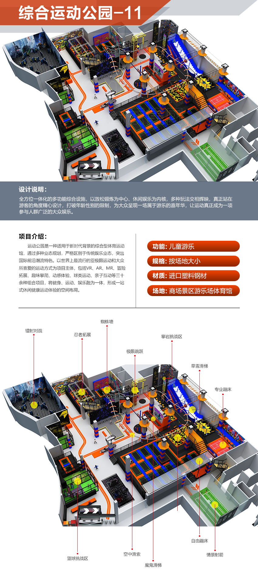 本項目適用于各種親子主題類的樂園,巧妙運用“熊貓”IP造型設計,集拓展、探險、滑道、飛索、蹦極、不銹鋼滑梯、攀巖、爬網等46種不同運動體驗的文化主題項目,結合“大灰熊”IP形象,融入相關設計元素,打造差異化的網紅IP主題性運動拓展營地綜合體。 在裝飾設計上采用竹葉和竹竿的綠色設計元素,以原生態、自然風格為基調,采用原木、繩網和不銹鋼等柔韌度好的生態材料。滿足大眾貼近自然、主題鮮明、寓教于樂的兒童素質訓練教育親子樂園的精神訴求。